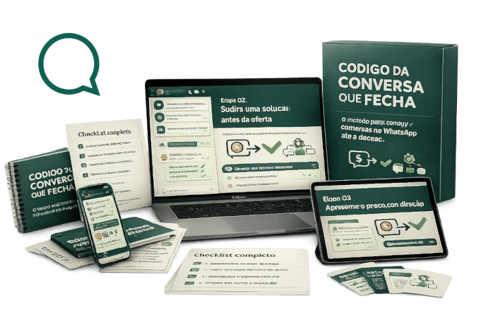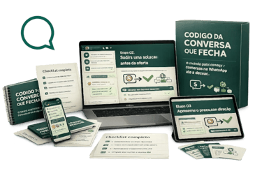 Feche mais clientes pelo WhatsApp sem dar desconto, sem parecer desesperado e sem ficar preso em conversas que morrem — usando o Código da Conversa que Fecha.