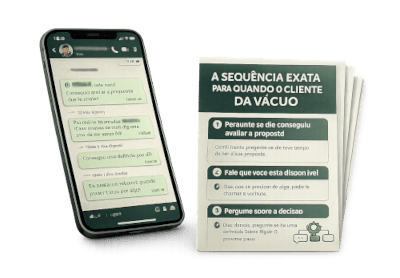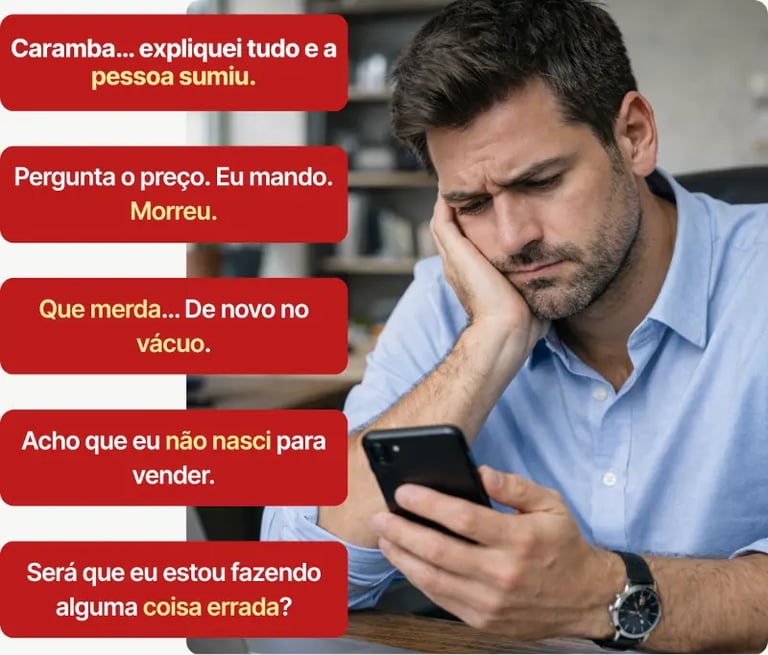 Continuar explicando, mandando preço… e vendo suas conversas morrerem no WhatsApp. Continuar tomando vácuo. Continuar negociando desconto. Continuar inseguro na hora de responder.